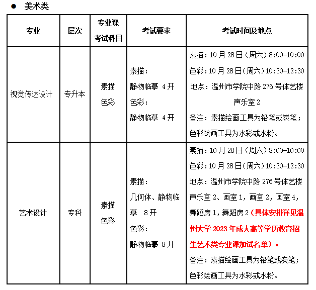 1、报到时间:美术类2023年10月28日(周六)上午7:20前报到;音乐类: 10月28日(周六)上午8:00前报到