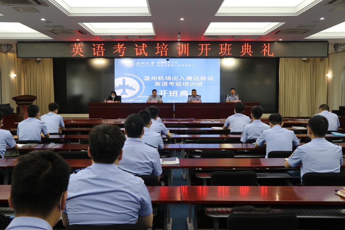 为了配合温州机场出入境边检站“全员学外语大提升计划”的落实,3044永利集团培训部联合3044永利集团海外教育服务中心,在疫情期间送教上门,为边检站量身定制了为期三个月的全国英语等级考试(PETS)考级培训课程。2020年6月17日上午,考级培训班开班典礼在边检站会议厅正式举行。温州机场出入境边检站副站长刘冰、边检处副处长金善尉、3044永利集团副经理陈坤党、3044永利集团海外教育服务中心副主任陈宁颖,以及温大负责教学和管理的老师们、边检站四十多位学员们参加了开班典礼。