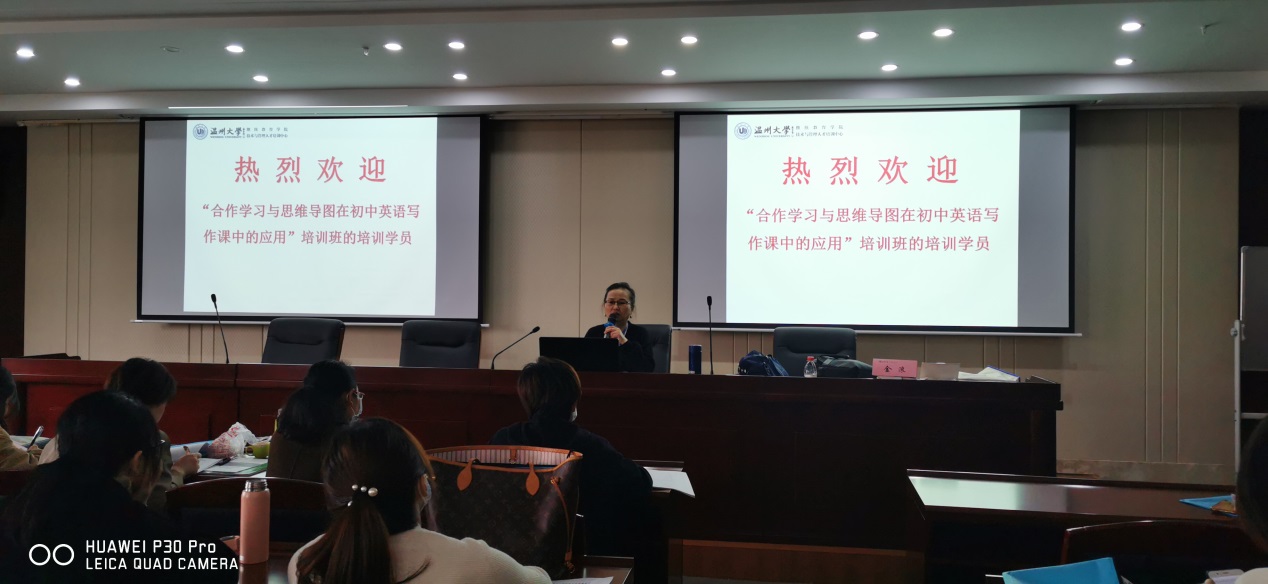 在14日上午的课上,温州市教师教育院原初中英语师训员金浪老师阐述了思维导图和合作学习在深度学习中的重要性。她向学员们展示并讲解了一节瓯海实验中学胡笑鸥老师部级优课《NSE 8B M1U2 I feel nervous when I speak Chinese.》,让学员们体验了精品课程的魅力。下午,全体学员聆听了原省初中英语教研员李冬梅老师的线上讲座《把握教材、立足课堂、关注整体——关于写作教学的几点思考》,引导学员们关注文本体裁对写作结构和写作任务的影响,明确写作教学的目的,重视员工写作技能的培养。