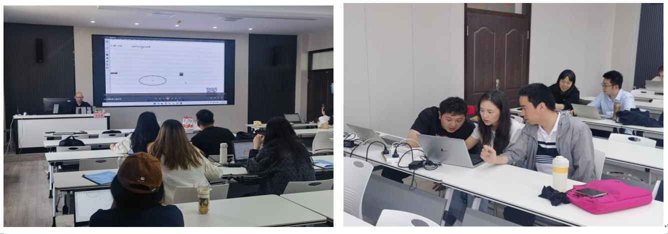 林老师以点、线、圆为基本元素,通过对这些元素的变换、构造、度量、计算、动画等,让学员们熟悉工具栏和快捷键的使用。这三天的学习不仅仅停留在信息技术层面,还对应到教学层面,进行信息技术与数学教学联系上的再认识。针对每个知识点,结合教学实践具体案例,林老师都要求学员们在电脑上进行同步实际操作,构造出课堂中常见的组合图形和动态图。在林老师深入浅出、幽默风趣的讲解下,大家感受到了几何画板强大的教学应用功能与魅力。期间吴瑶思老师及钱杨暘、林奇霖老师为学员们耐心指导,答疑解惑。经过3天的认真学习和实战操作,学员们已经能够借助几何画板制作一些简单的教学课件。
