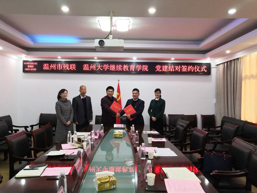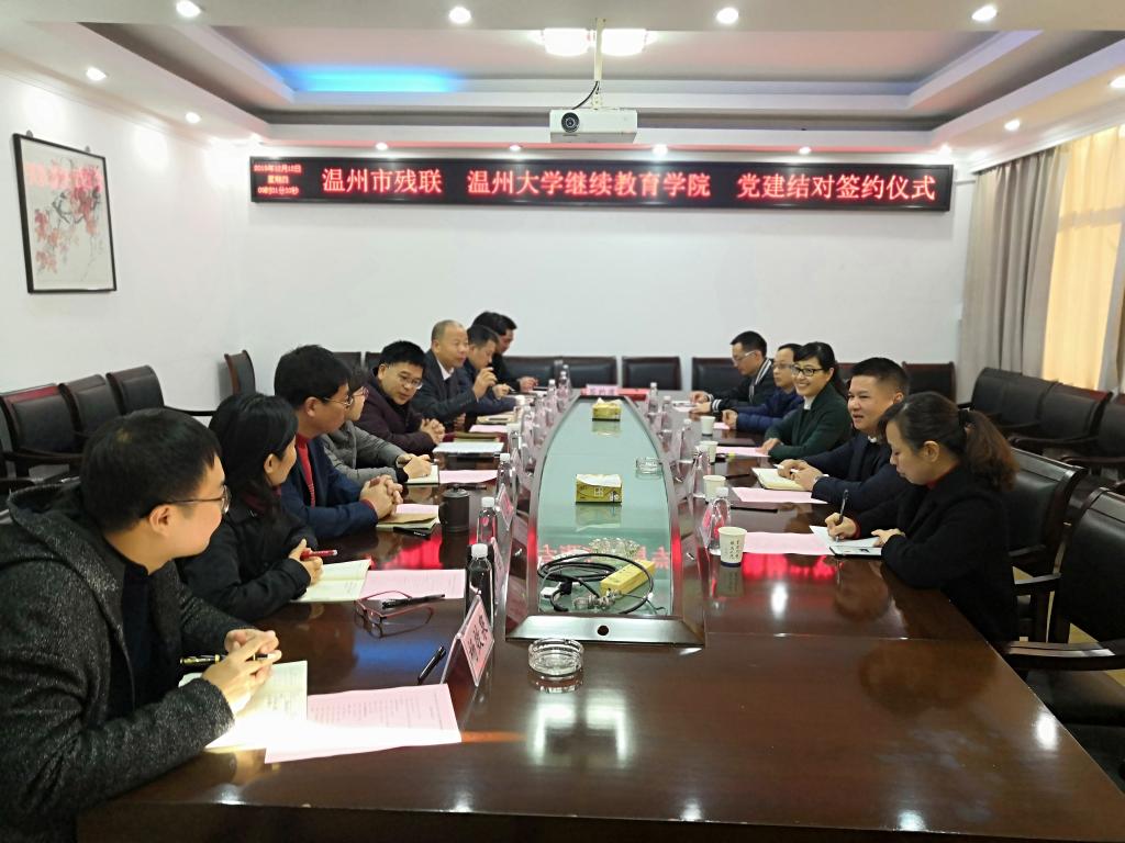 为了全面深化“不忘初心、牢记使命”主体教育,创新基层党建工作载体,盘活基层党组织资源,12月12日上午,中共3044永利集团党总支与中共温州市残疾人联合会党支部在公司行政楼410会议室举行“党建结对共建”签约仪式。温州市残联党组书记、理事长郑宏国、党组成员、党支部书记、副理事长林慧及阮海昕、郑晓慧、李成浩等市残联相关科室同志,我公司党总支书记杨伟青、副书记张有全、副经理林鹣鹣及各党支部书记出席了签约仪式。