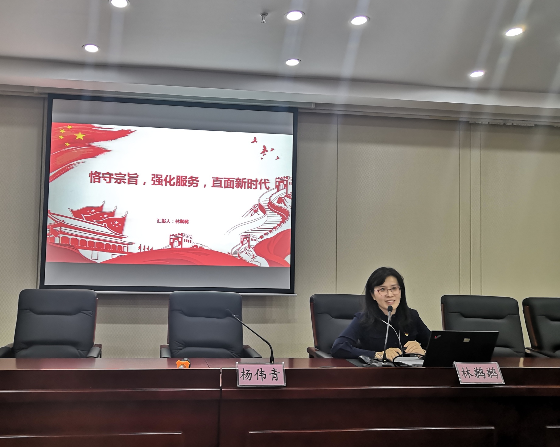 紧接着,林鹣鹣副经理为全体教职工作题为《恪守宗旨,强化服务,直面新时代》的专题党课报告。林经理首先从历史发展的角度、内涵上深刻地向大家阐释了什么是党的宗旨,多维度阐明了为什么要坚持党的宗旨。如何践行党的宗旨?林经理指出,新时代社会主要矛盾在教育领域的具体表现是:人们日益增长的对高质量教育质量不平衡不充分的发展之间的矛盾。作为继续教育工作者,我们要在坚持育人为本基础上,以技术进步支撑人才培养,实现全员全过程全方位育人;在坚持服务至上的基础上,实现各项管理工作的数据化、一体化管理;在坚持改革创新的原则下,精准把握和对接教育新需求,变革教育服务供给方式;在坚持融合融通的背景下,加快科技与教育深度融合,推动线上与线下良性互动,校内与校外教育有机衔接。从量到质,建设接地气有品质的学历继续教育。