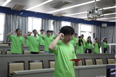在杨效泉老师的解说下,全体师生共同观看了去年公司暑期社会实践活动的有关介绍。随后,白炳贵科长向大家介绍了2019年暑期社会实践队的情况。今年公司暑期社会实践共计一支队伍,共计25人。在这个炎热的七月,社会实践队员们将以康龙社区文化大礼堂为活动场所,以国学诵读和公益支教为主要内容,以弘扬优秀传统文化和助残扶残精神为主要目的,进行为期半个月的暑期社会实践。之后,戴豪锃同学作为实践队代表发言,他表示全体队员一定会全身心投入到这次意义非凡的暑期社会实践活动中来。在院团委员工会主席吴怡娴、副主席陈家乐同学的领誓下,全体实践队员共同对着院旗宣誓,表示将深入践行“积极、阳光、创新、责任”的公司传统,发扬“奉献、友爱、互助、进步”的志愿精神,为此次暑期社会实践活动贡献自己的力量。