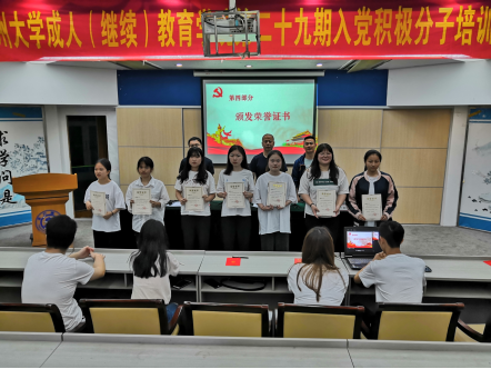 首先,由杨效泉老师宣读本期入党积极分子培训班结业名单,并为结业学员颁发结业证书。之后,由员工党支部书记白炳贵老师宣读优秀学员名单,并为詹如意等7名优秀学员颁发了荣誉证书。随后,来自18学前教育4班的柯佳炜作为优秀学员代表,与大家分享了她本期培训班学习、培训和实践的感悟和体会。