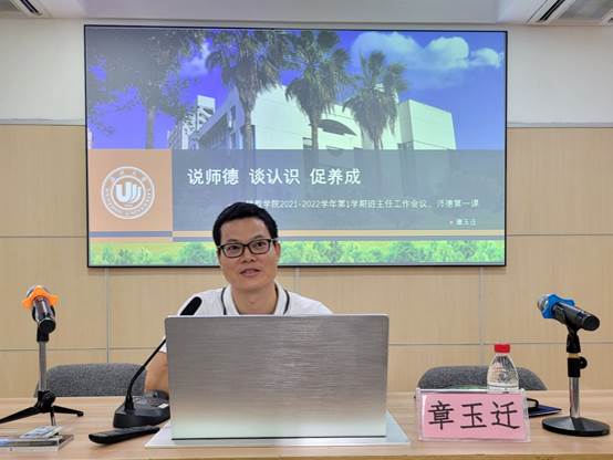 最后,学历教育二部主任章玉迁老师以《说师德、谈认识、促养成》为题,作新学期师德师风建设专题讲座。讲座以师德概念认识、师德建设的挑战、师德养成和温大师德规范四个方面展开。章玉迁指出,全体班主任要坚定理想信念,厚植爱国情怀,涵养品德修养,以身作则,率先垂范,才能为党育人,为国育才。