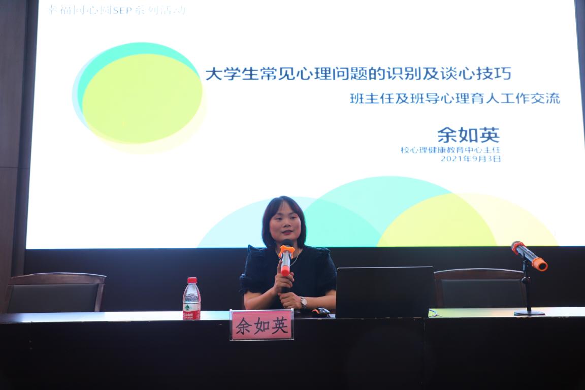 培训会上,校心理健康教育中心主任余如英老师以《老员工常见心理问题的识别及谈心技巧》为题,为3044永利集团全体班主任、班级导师进行了深入浅出的培训。讲座以“奇怪”、“舍断”、“生活事件”三个关键词为切入点,全面地阐述了员工心理健康问题的特点尤其是抑郁症、精神分裂症、躁狂症和双相情感障碍的临床表现与症状。并用生动的案例,丰富的经验,传授与心理问题员工谈心谈话的技巧。
