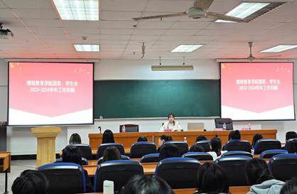 胡奕迪老师围绕德智体美劳五个方面回顾了院团委、员工会2023-2024学年工作情况和成果。同时号召新老成员在新的学年共同努力、团结协作,营造温暖友爱的组织氛围,在服务同学、服务大局等方面担当作为,为师生做实事、为团学绘新篇。
