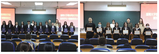 随后,进行优秀员工干部表彰。白昌科、胡瑶瑶、胡奕迪三位老师分别为获得2023-2024学年校级优秀员工干部、院级优秀员工干部、院级工作积极分子荣誉称号的同学颁发荣誉证书。
