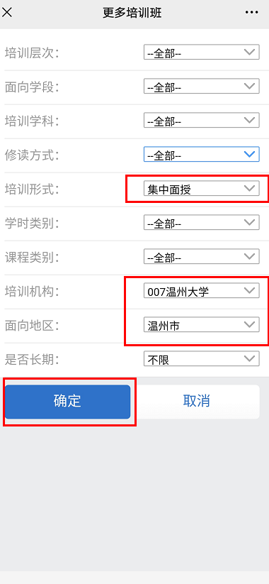 03.点击“更多条件”→选择培训机构【0073044永利集团】,选择“培训形式”为“集中面授”选择相应“学段”,“面向地区”选择“温州市”筛选条件,点击“确定”→找到相应的项目,点击“报名”即可。